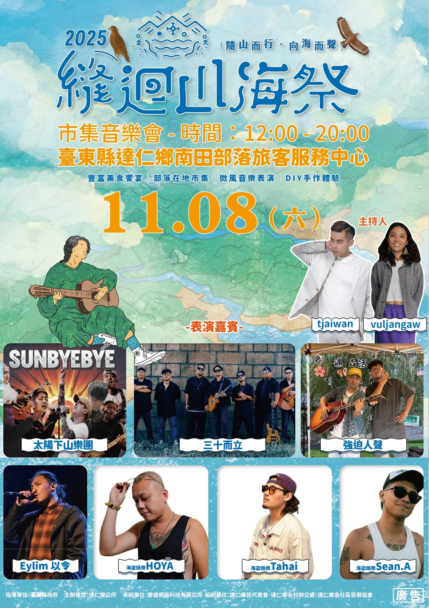 二、活動訂於114年11月8日(六)下午12時至下午20時,假達仁鄉南田村(南田遊客服務中心前廣場)辦理,內容包含市集活動、舞台演出、手作體驗等。