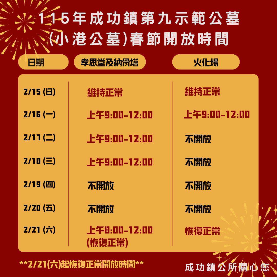 各位鄉親大家好,本鎮第九示範公墓(小港公墓)115年農曆春節調整開放時間如下: