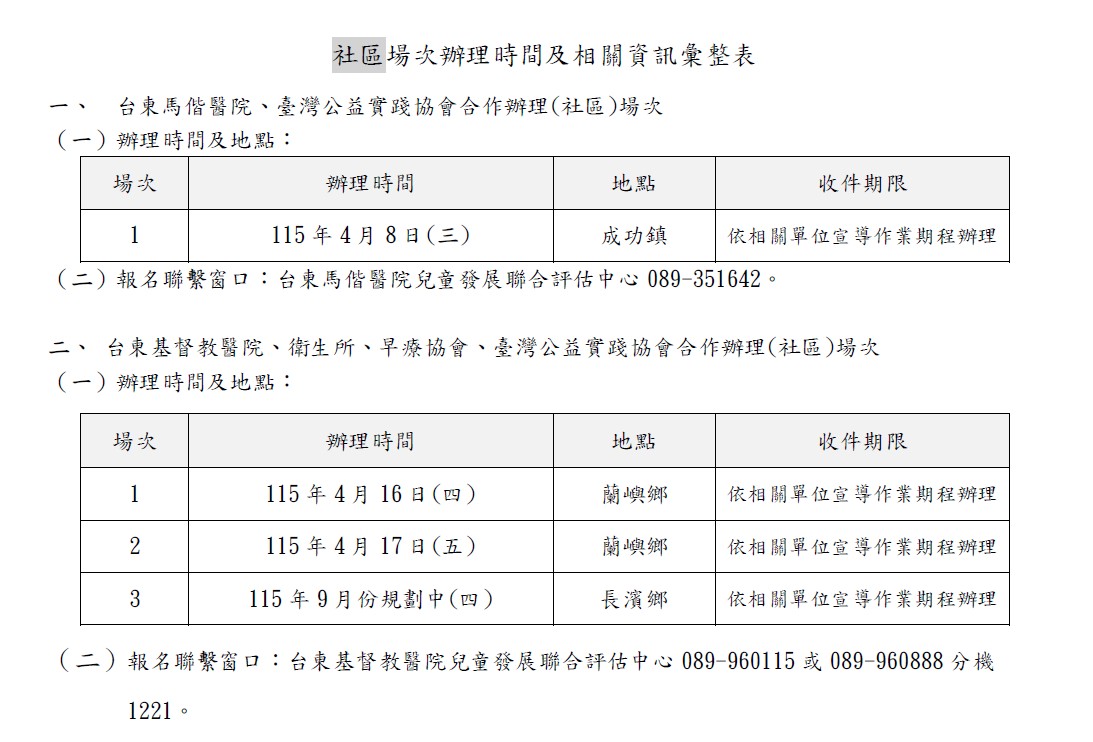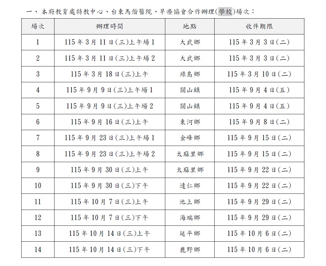【轉知】臺東縣115年度學前外展式兒童發展聯合評估,請欲申請個案留意各場次收件期限