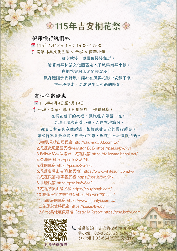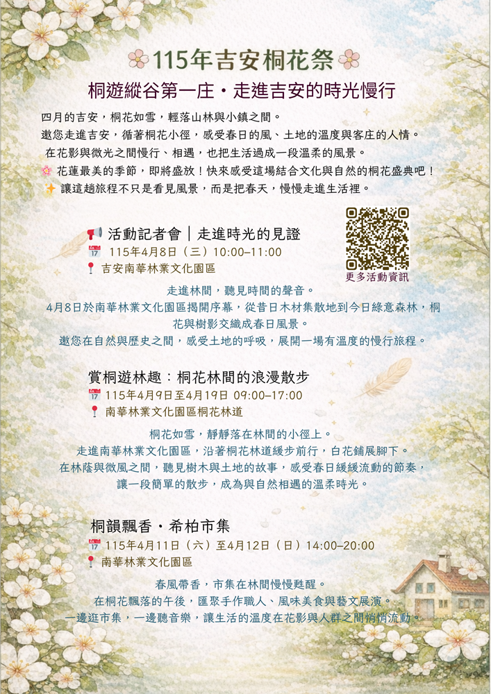一、為推廣客家文化藝術與自然景觀之美,花蓮縣吉安鄉公所規劃辦理「2026吉安桐花祭」系列活動。本次活動特別結合南華林業文化園區之歷史底蘊,透過慢行體驗、藝文市集與在地住宿優惠,引領民眾走進自然,感受土地與人文交織的時光慢行。