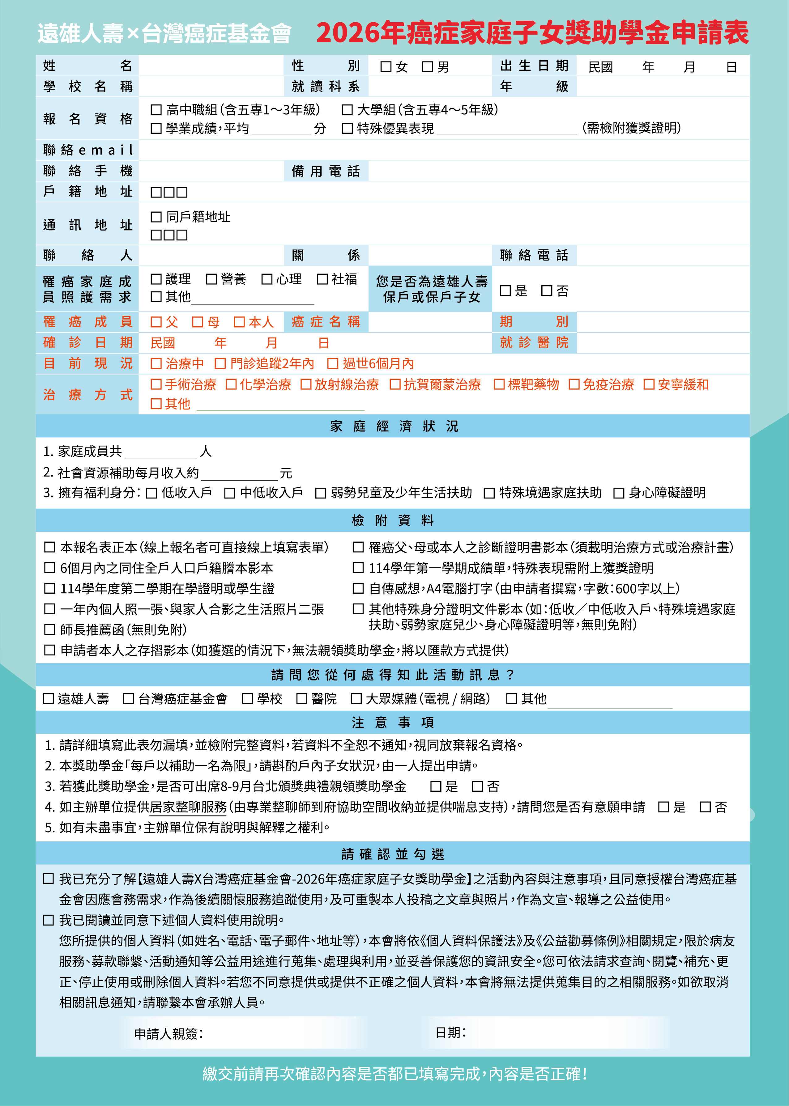 2.郵寄掛號:至台灣癌症基金會官網「最新消息」下載申請表,填寫完整連同檢附資料寄至105台北市南京東路五段16號5樓之2,並註明「2026台癌x遠雄人壽-癌症家庭子女獎助學金活動小組收」。